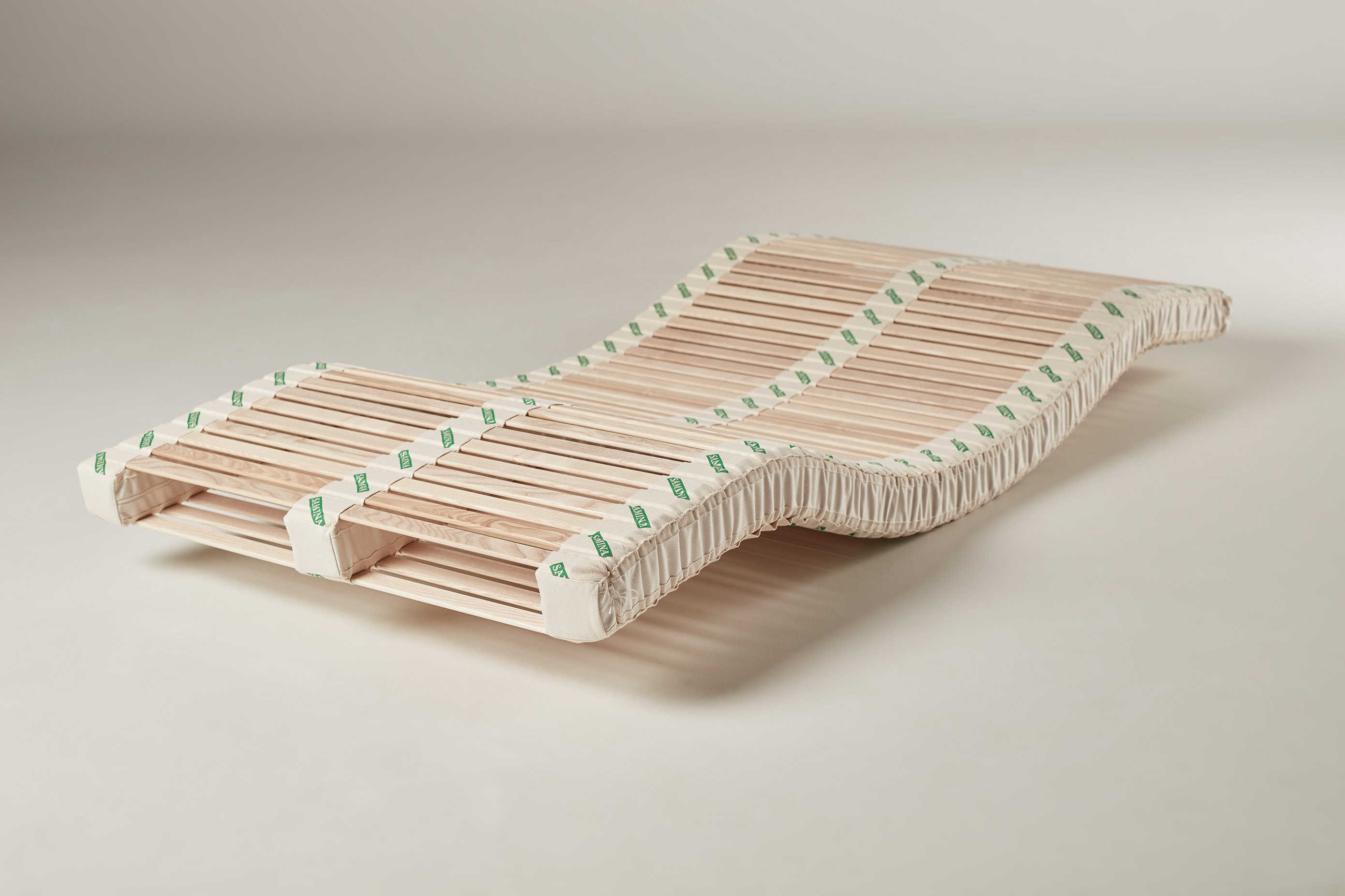 Die Federelemente des Bettrostes bestehen aus einem hochwertigen Naturkautschukkern, welcher von einer Baumwollhülle eingefasst ist. Die Lamellen sind aus massivem, elastischem Eschenholz gefertigt, welche nach der Belastung durch den Schläfer immer wieder ihre ursprüngliche Form annehmen.